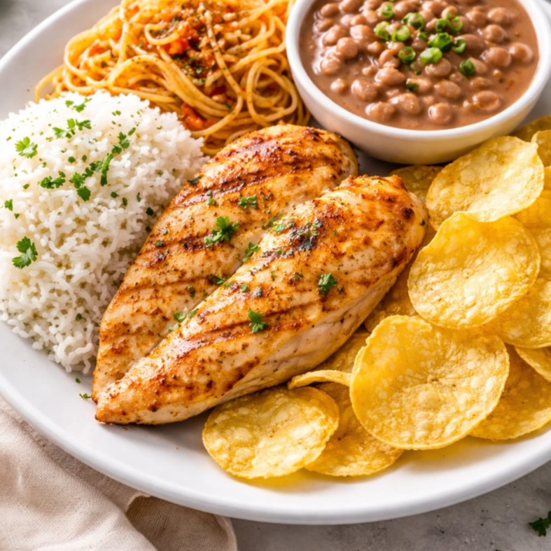 Filé de peito arroz carioca, feijão e macarrão e para abrilhantar seu almoço batata frita