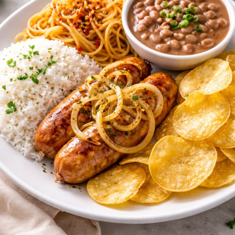 Linguiça de Frango acebolada arroz carioca, feijão e macarrão e para abrilhantar seu almoço batata frita