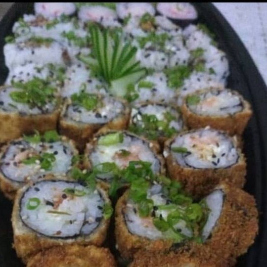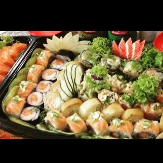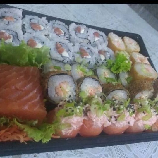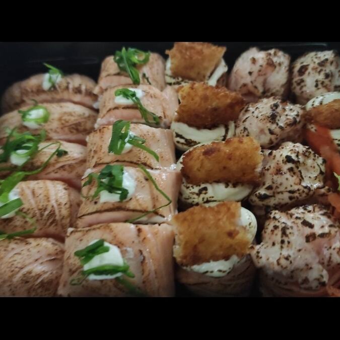 10 uramakis de camarão empanado,10 hossamakis de kani,10 cariocas de salmão,5 crock de salmão,3 niguiris de kani,3 niguiris de salmão,2 niguiris de camarão e 2 niguiri de salmão maçaricado!!