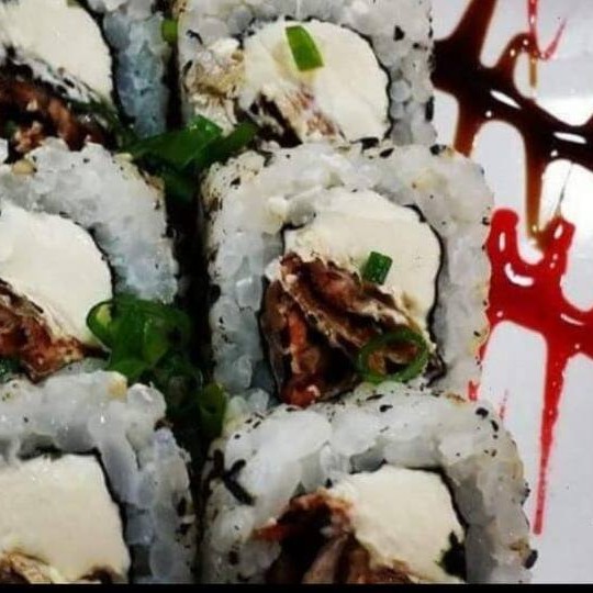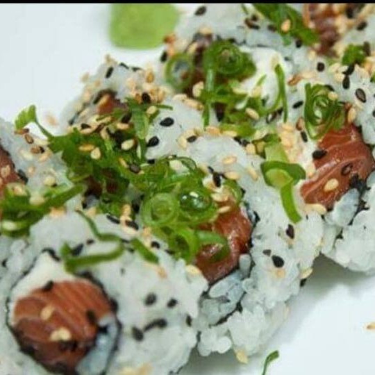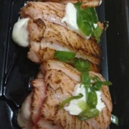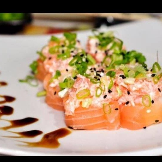 Arroz,cream cheeser,cubos de salmão maçaricado envolto na lâmina de salmão maçaricado!!