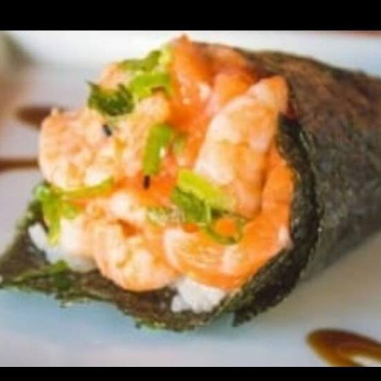 Temaki na alga, arroz,cream cheeser, camarão empanado, salmão, cebolinho e finalizado com gergelim torrado!!
