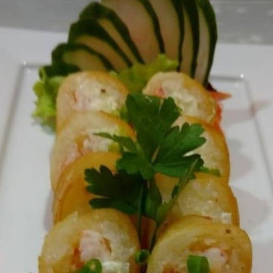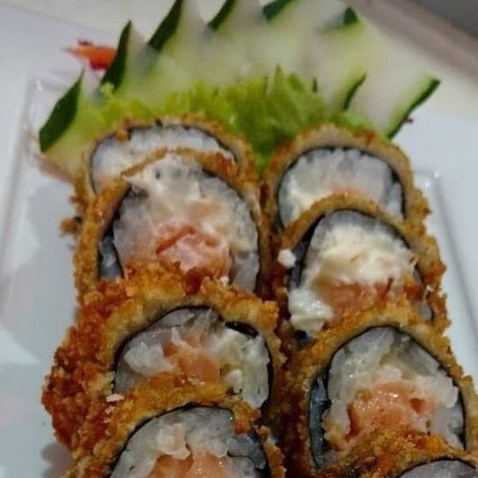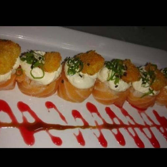 Arroz,cream cheeser, camarão empanado envolto por lâmina de salmão maçaricado!!