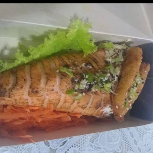 Arroz envolto na lâmina de salmão coberto com cream cheeser e camarão empanado!!