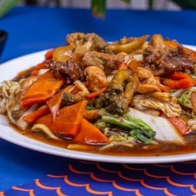 Macarrão oriental com camarão, carne e frango acompanhado com legumes frescos e finalizado com molho à base de shoyu e sem falar do tempero do chefe :) Contém: cenoura e acelga.
