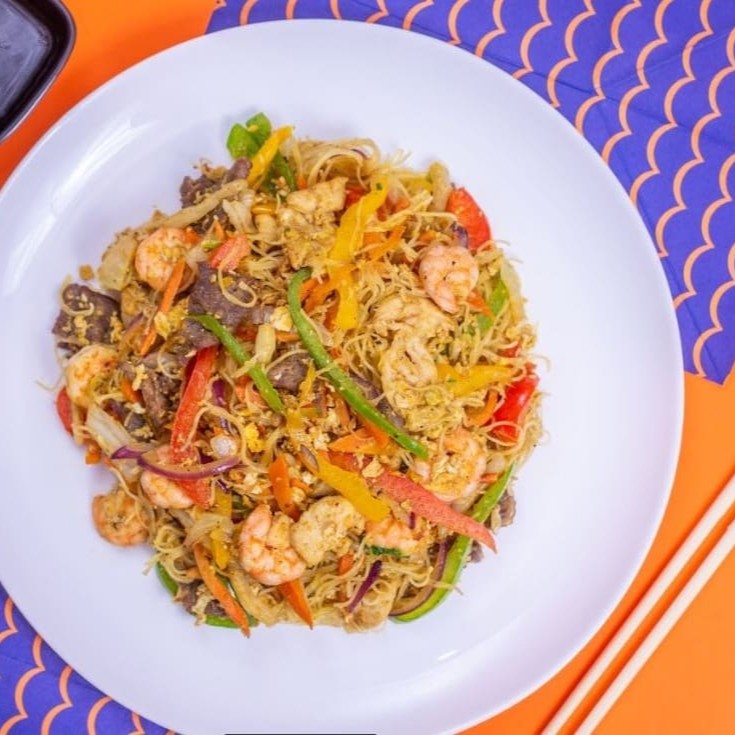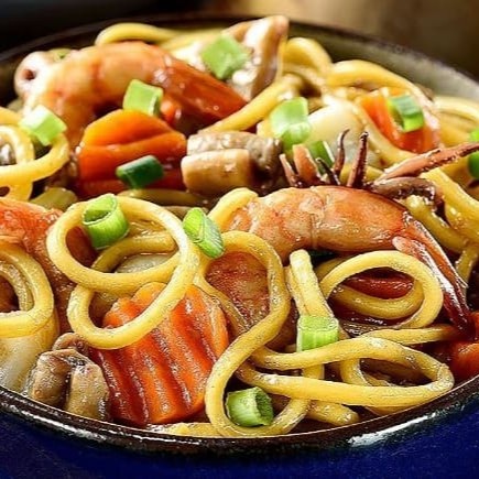 Macarrão bifum ao curry ( levemente apimentado) com legumes , frango, carne e camarão. Média de 800g