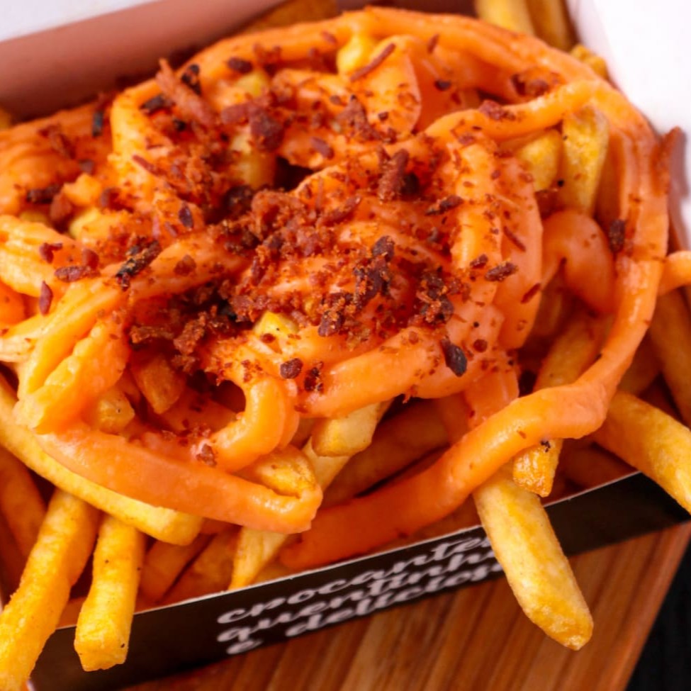 Batata frita crocante com nosso maravilhoso cheddar cremoso e nossa deliciosa farofa crocante de bacon. (Apróx. 200g) #lovebacon #pensouburguerpensousrneves