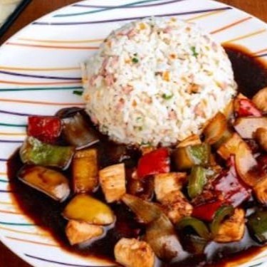 O encantador 'Frango Xadrez - Acompanhado de um arroz fresco e perfeitamente cozido, frango com legumes e molho do chefe. Média 800g