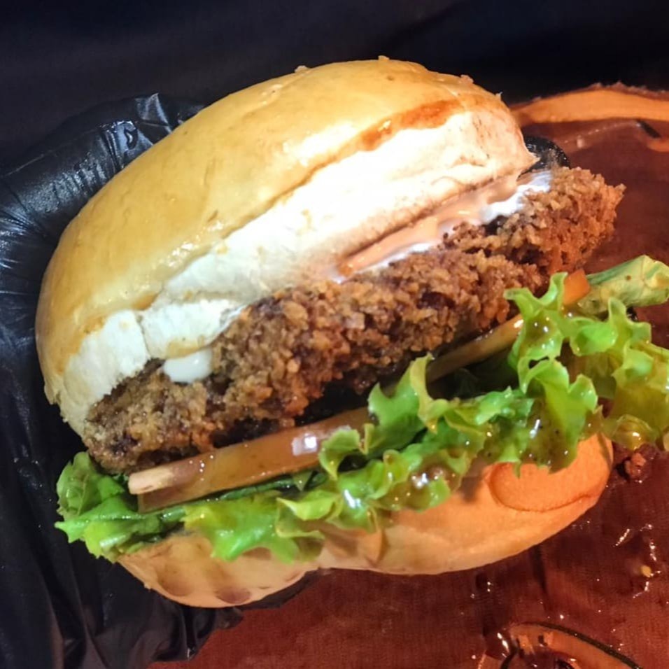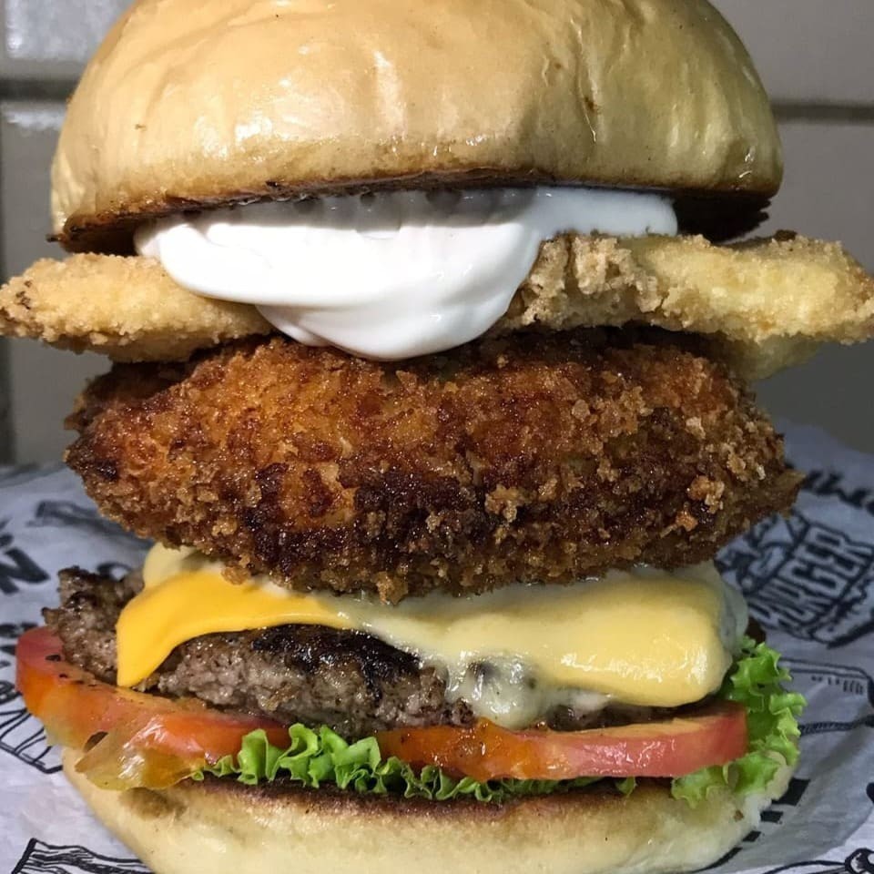 Pão, blend 120g, cheddar, mussarela, frango crocante 140g, queijo coalho empanado, maionese defumada, barbecue, alface, tomate e cebola caramelizada