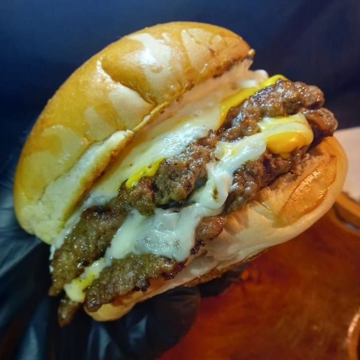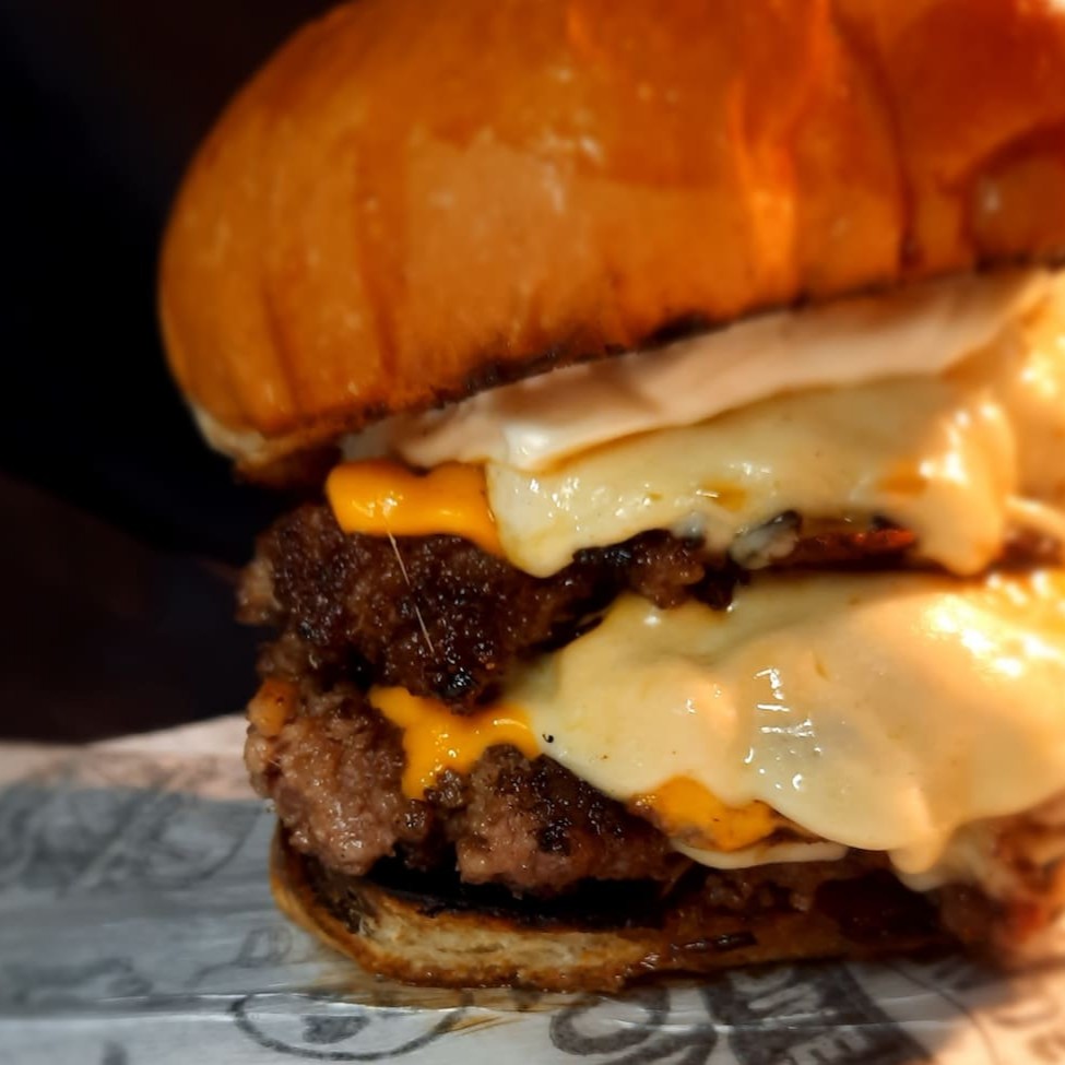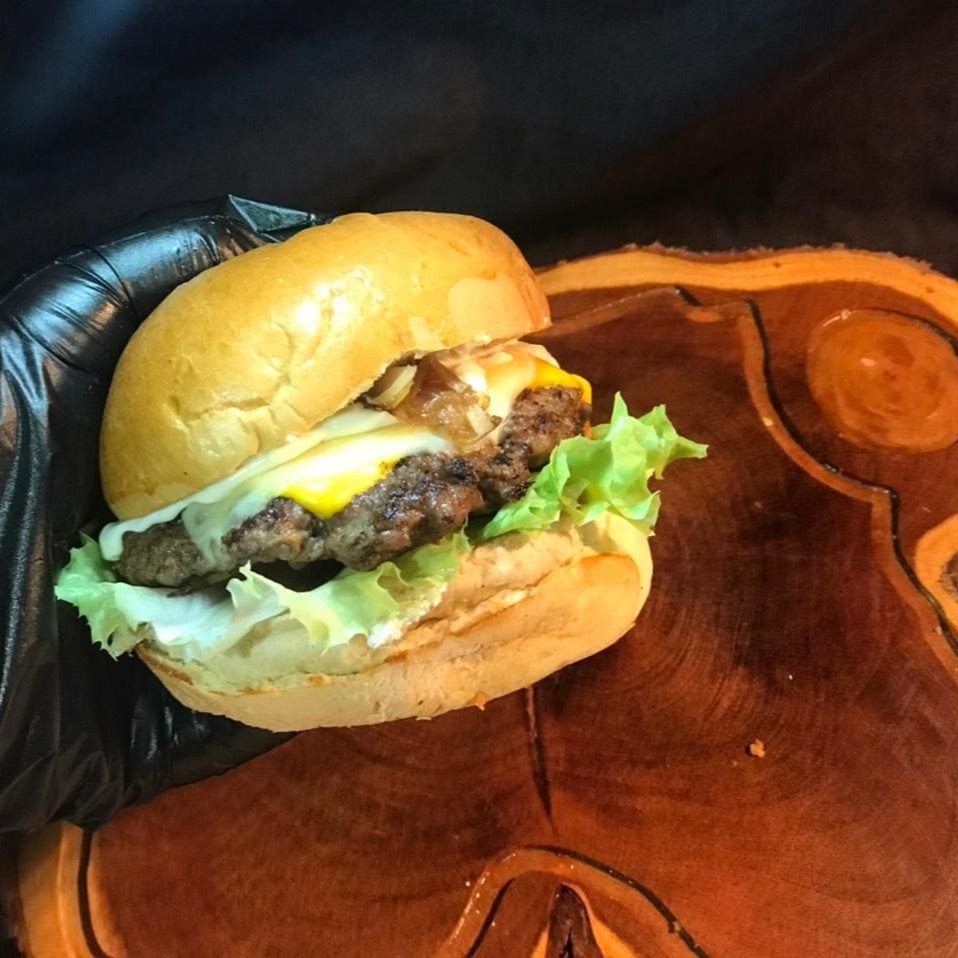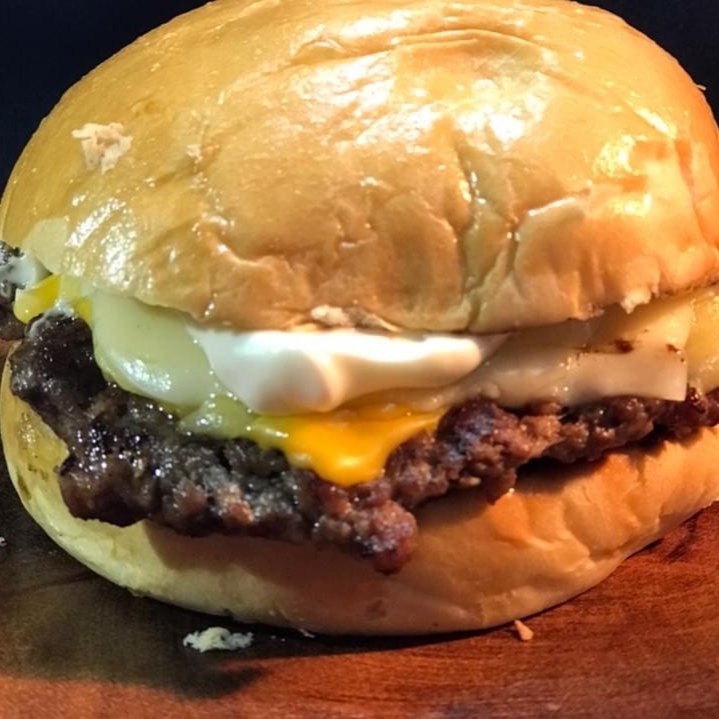 Pão, carne 100g esmagada na cebola , queijo cheddar, mussarela , onions rings e maionese defumada
