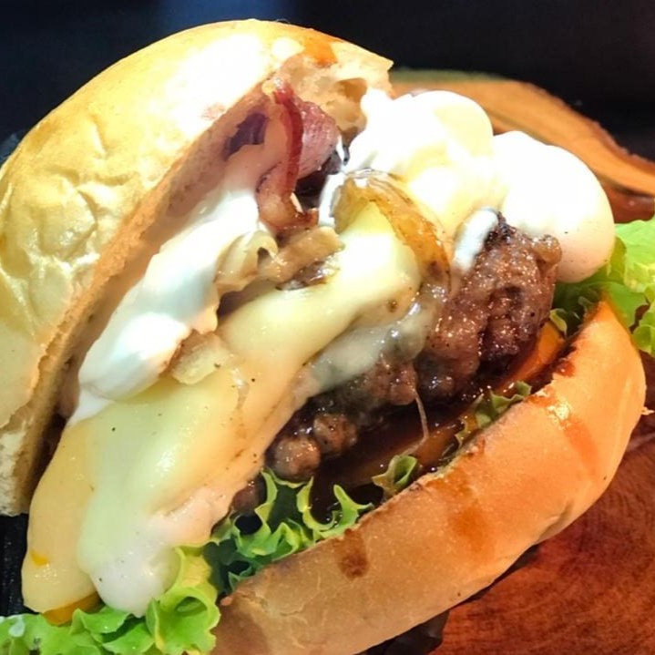 Pão / Carne 100g / Queijo Cheddar / Muzarella / Maionese defumada.