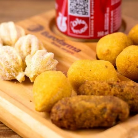 15 Mini salgados variados, fritos na hora, douradinhos e super crocantes! Ideal para quem gosta de experimentar vários sabores em um só pedido. Para completar, Coca-Cola lata 220ml grátis, deixando seu lanche ainda mais completo, prático e econômico.