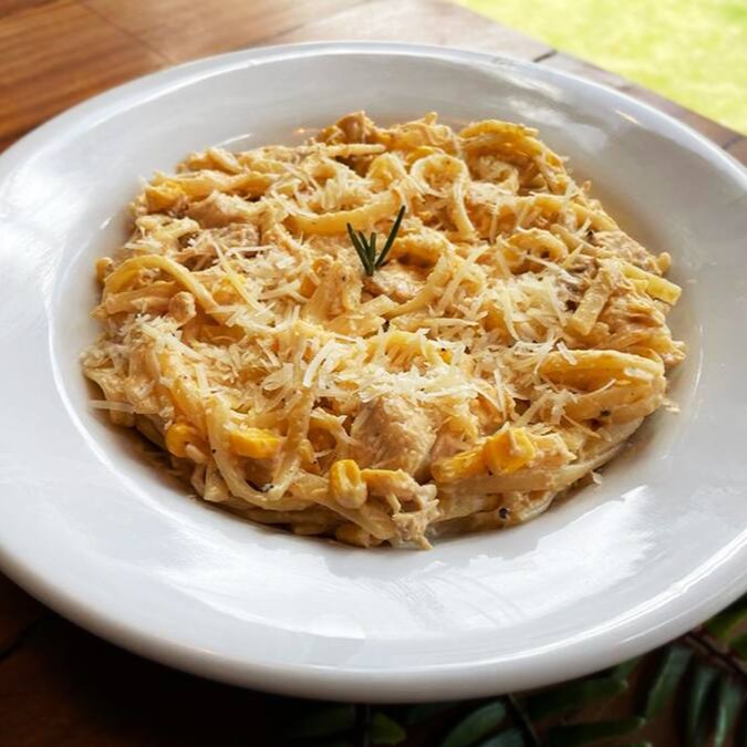 Filé de peito de frango e fettuccine. Acompanha um molho especial da casa, milho e queijo parmesão ralado.