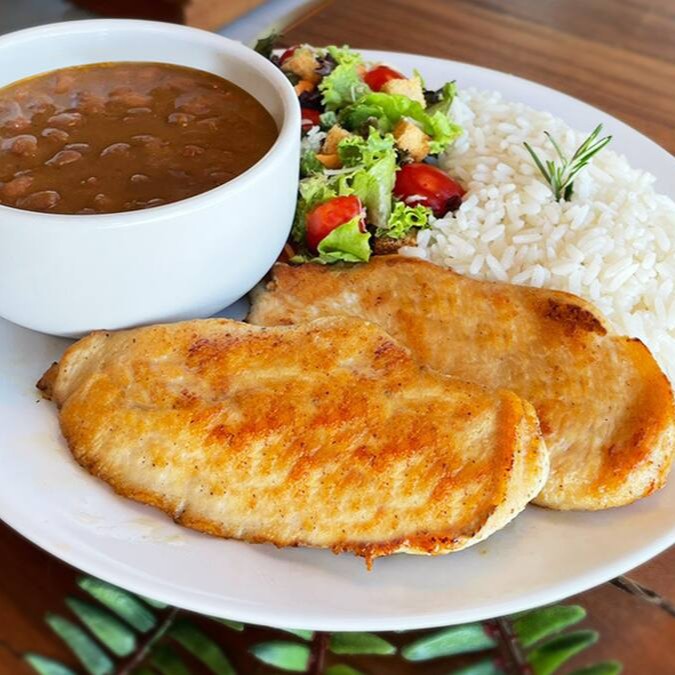 Este prato é composto por filé de peito de frango grelhado. Acompanha um arroz parboilizado, leve e soltinho, junto com o nosso tradicional feijão carioca e salada da casa.