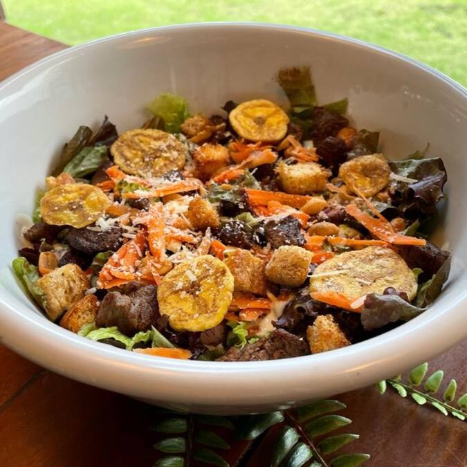 Filé mignon em cubos, folhas frescas, cenoura, croutons, banana desidratada, castanha de cajú, molho da casa e queijo parmesão ralado.