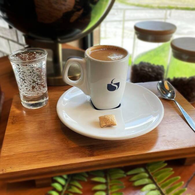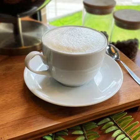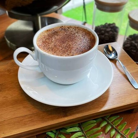 Cappuccino Start. Café espresso, achocolatado da casa vaporizado e canela. (180ml)