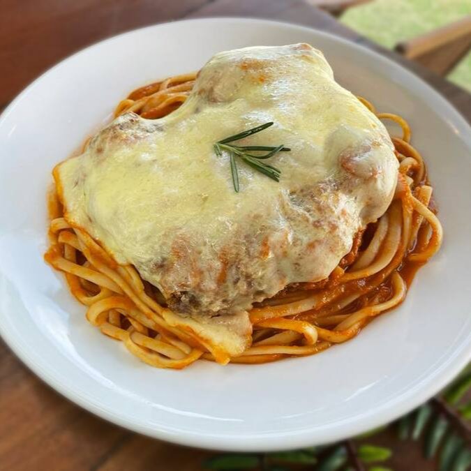 Filé mignon empanado em farinha panko, com molho de tomate. Acompanhado de um fettuccine al dente com molho de tomate e queijo parmesão ralado.