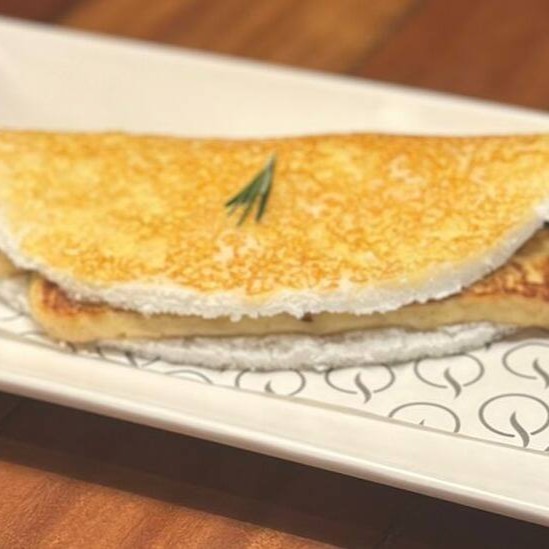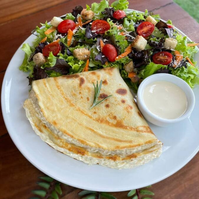 Crepe com recheio de queijo mussarela, queijo coalho, cream cheese e queijo parmesão. Acompanha salada da casa e molho de mostarda e mel.
