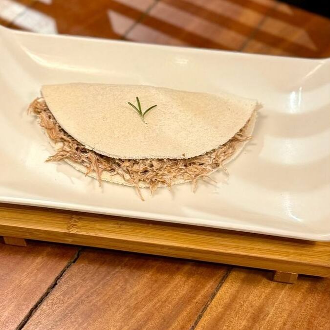 Massa de tapioca rendada com carne de sol, queijo coalho e cream cheese.