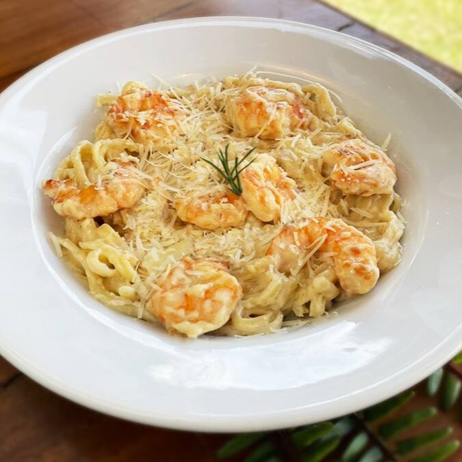Filés de camarão, servidos com fettuccine com molho de queijo e queijo parmesão ralado.