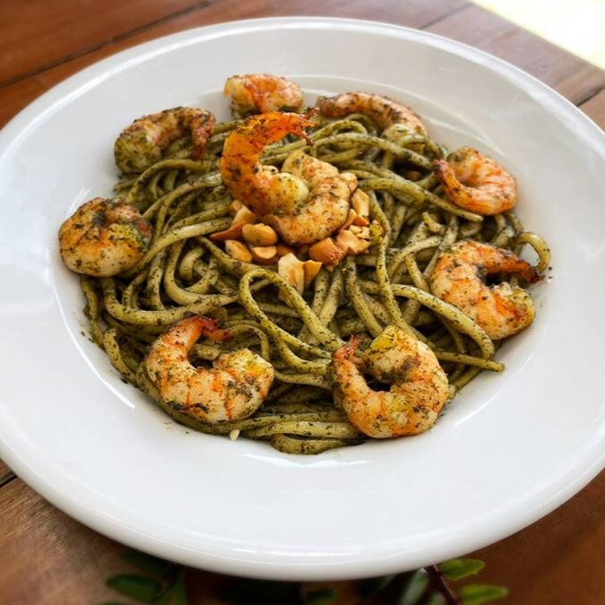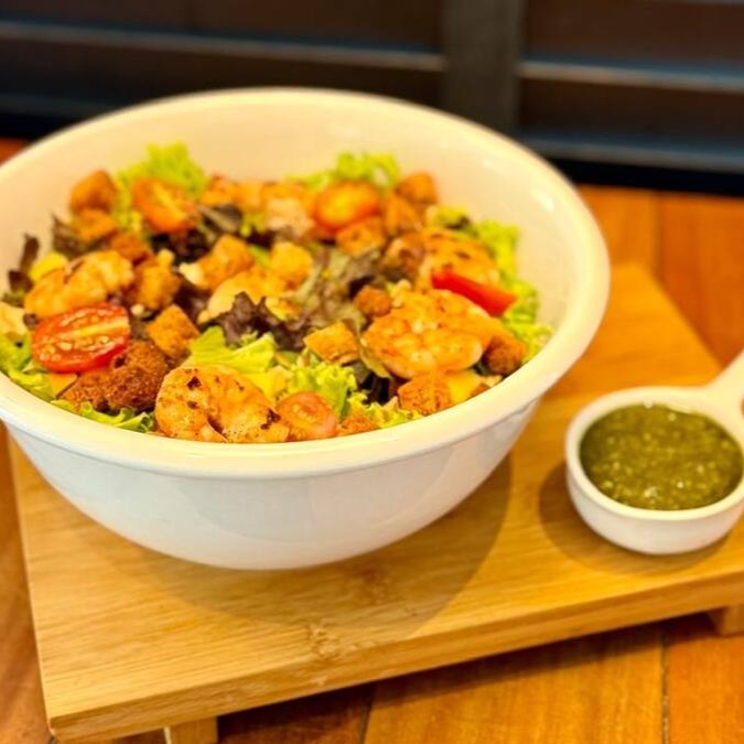Filé de camarão, tomate cereja, folhas frescas, manga, castanha de caju e molho balsâmico.