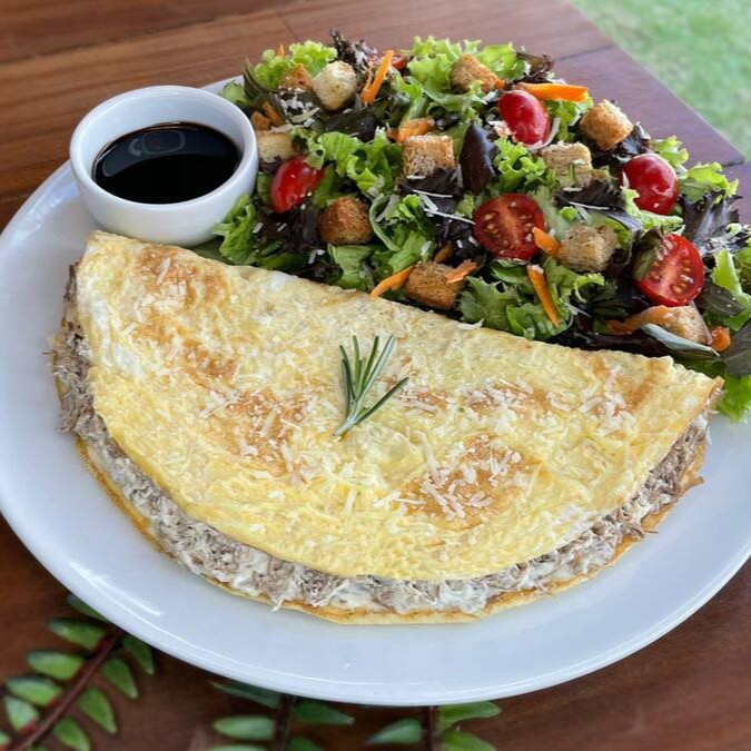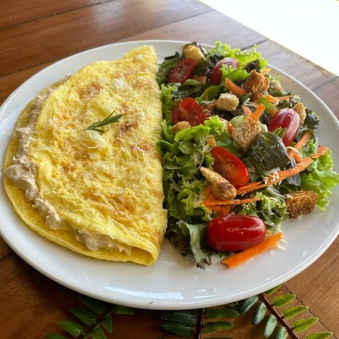 Omelete recheado com queijo mussarela, queijo coalho, cream cheese e queijo parmesão. Acompanha salada da casa e molho de mostarda e mel.