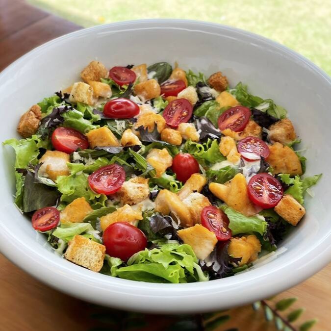 Cubos de filé de peito de frango, folhas frescas, croutons, tomate cereja, molho Caesar e queijo parmesão ralado.