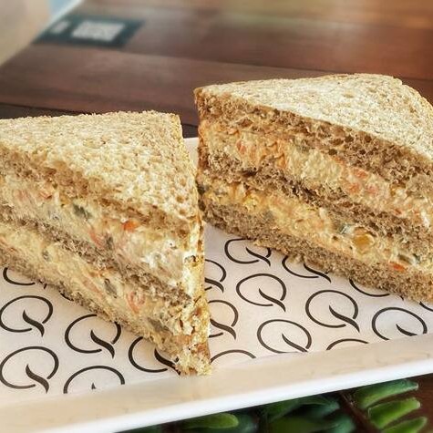 Pão de forma integral triplo, peito de frango desfiado, cream cheese, azeitona, cenoura e milho.