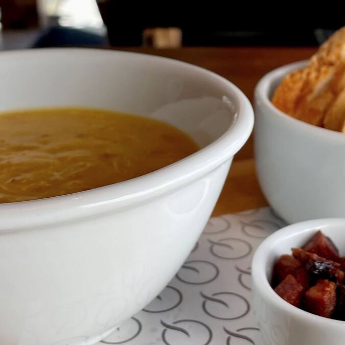 Sopa com peito de frango desfiado, alho poró, macaxeira, calabresa e cenoura. Acompanha torradas. Obs: Não é possível retirar os ingredientes da sopa, apenas os acompanhamentos.