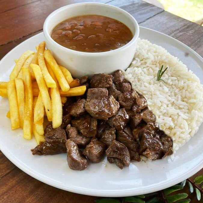 Filé mignon em cubos ao molho madeira. Acompanha batatas fritas, arroz parboilizado, feijão carioca e farofa temperada.