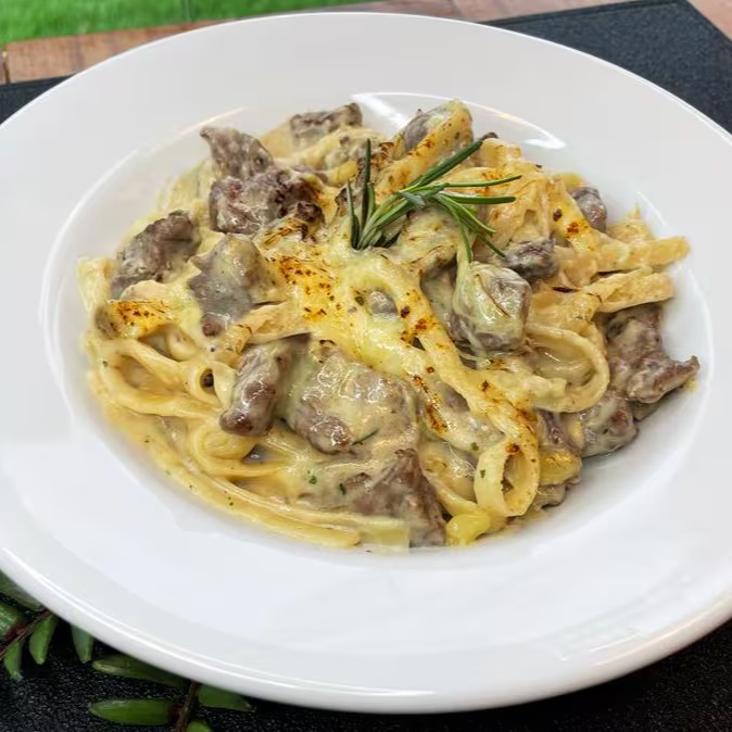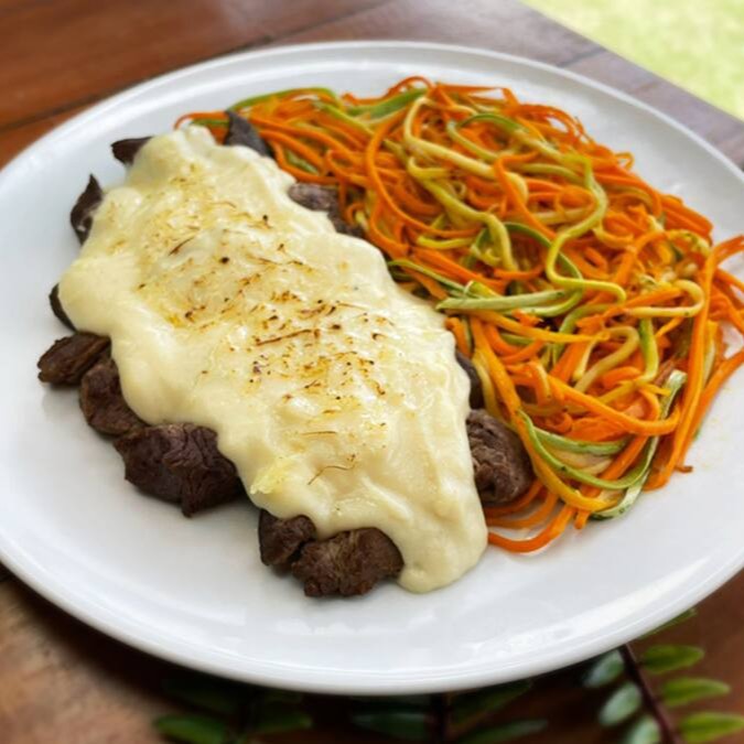 Filé mignon e cubos, coberto com creme de queijo da casa. Servido com espaguete de legumes frescos e queijo parmesão ralado.