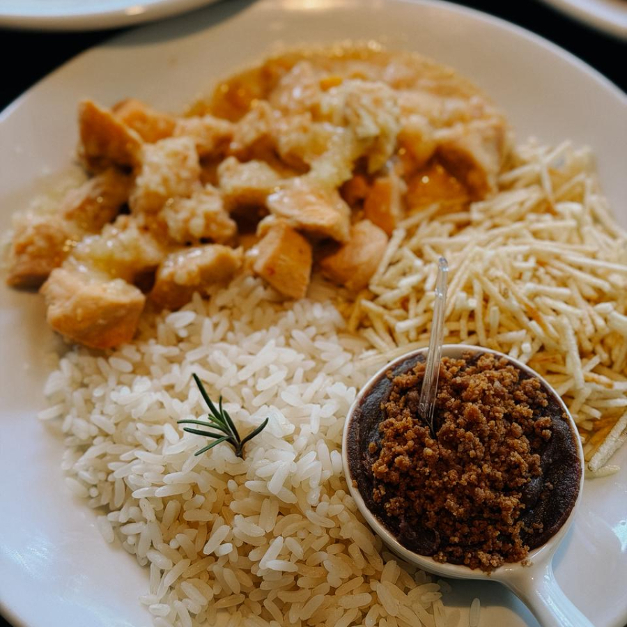 Cubos de filé de peito de frango com milho, arroz e batata palha + Guaraná Antarctica ou Coca- Cola ( Lata ) + Brigadeiro no pote.