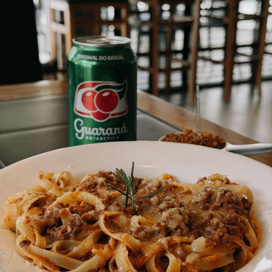 Fettuccine com carne moída, molho de tomate e queijo parmesão + Guaraná Antarctica ( Lata ) + Brigadeiro no pote.