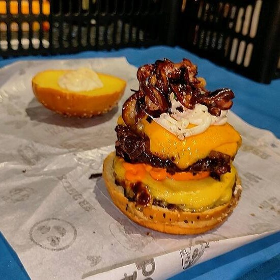 Para quem tem fome de verdade Duplo blend de fraldinha extremamente suculento, com muçarela, cheddar, bacon crocante, cebola caramelizada, alface, tomate e maionese especial. Grande, potente e inesquecível