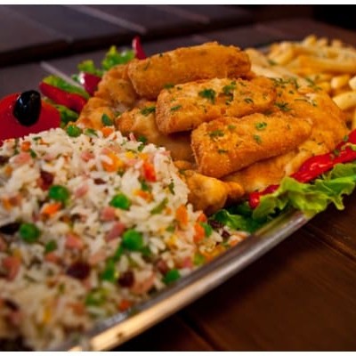 Frango empanado, batata frita arroz a grega e banana empanada