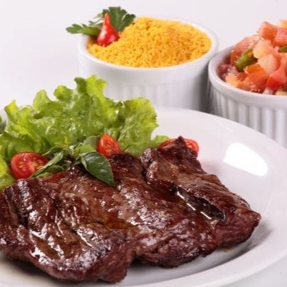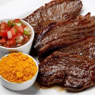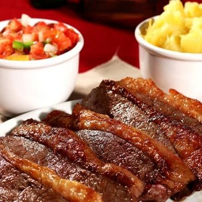 Carne assada na brasa. Acompanhamentos: Arroz Branco, Feijão macassar, Maionese de batata, Molho verde e Farofa.