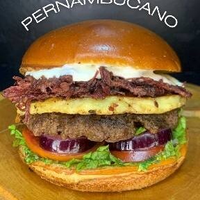 Pão Australiano macio, um blend 100g prensado na chapa, queijo coalho, carne sol, cebola roxa, tomate, alface molho casa.