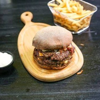 Pão brioche, um blend 100g prensado na chapa, queijo, Bacon crispe crocante, picles e molho da casa.