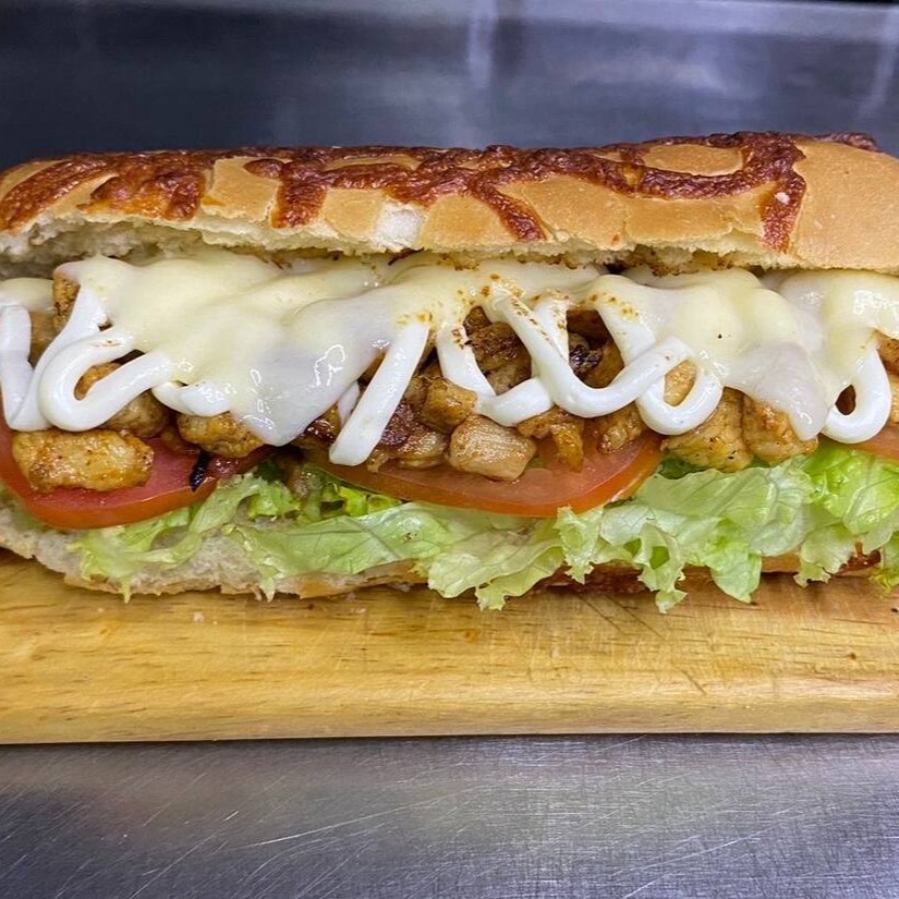 Pão baguete prioche de provolone, frango em cubo, creme cheese maçaricado,queijo muçarela e molho escolha
