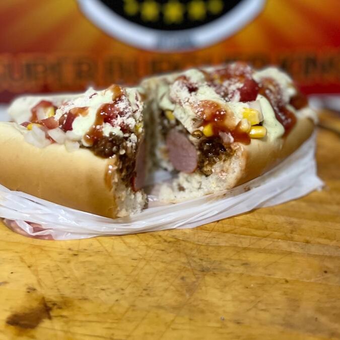 Pão dog salsicha carne moída ao molho tomate cebola milho catchup maionese batata palha queijo ralado