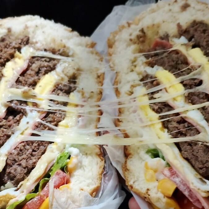Pão bola 2 hambúrguer artesanal ovo queijo presunto tomate alface milho maionese temperada