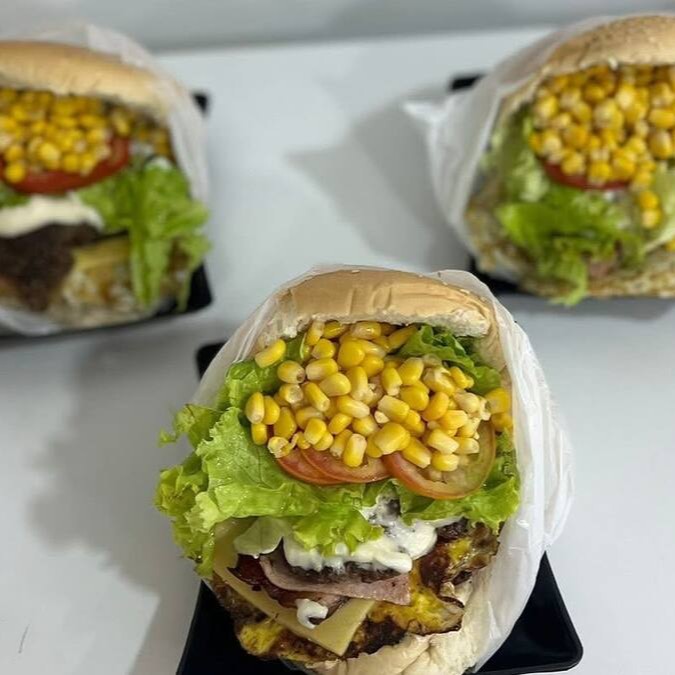 Pão bola 2 hambúrguer artesanal 2xbacon 2xchedda tomate alface milho maionese temperada