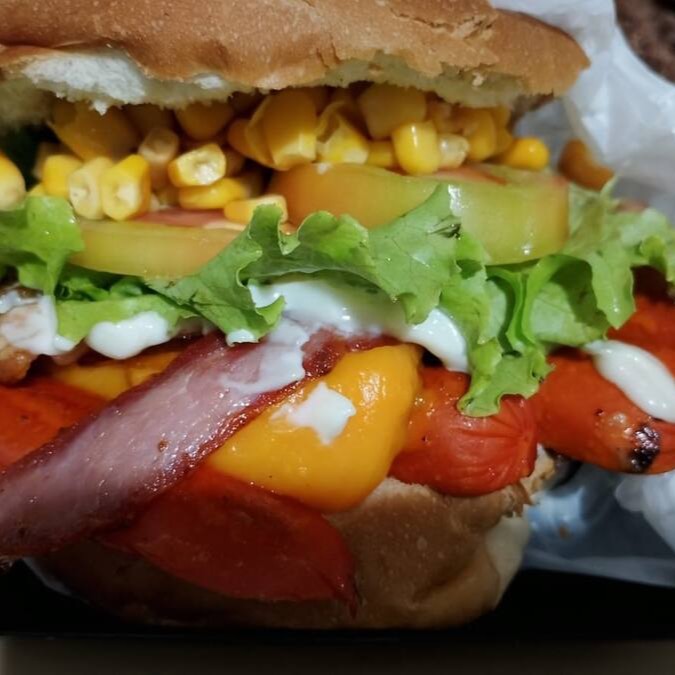 Pão bola 2 salsicha queijo chedda bacon tomate alface maionese tempera milho