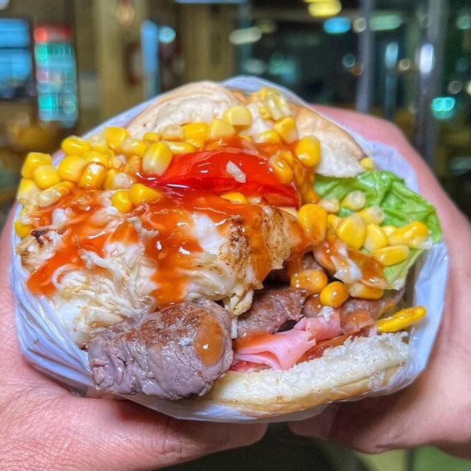 Pão bola 3 hambúrguer artesanal 3ovo 3 presunto 3 queijo 3 bacon tomate alface milho maionese temperada