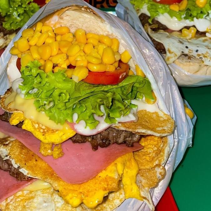 Pão bola 2hambúrguer artesanal 2ovo 2 queijo 2 presunto tomate alface milho maionese temperada