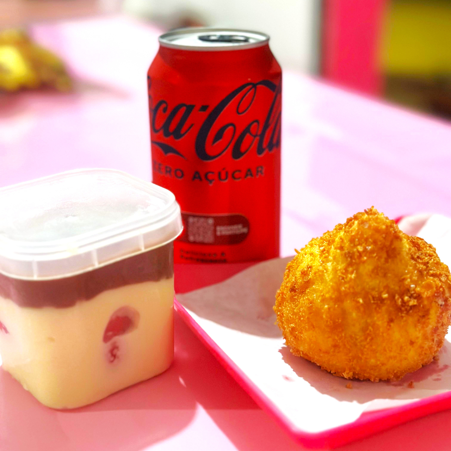 1 COXINHA DE FRANGO COM CATUPIRY PREMIUM + 1 BOLO BRIGADEIRUDO+ 1 REFI LATA
