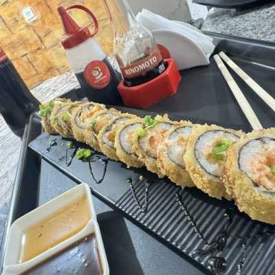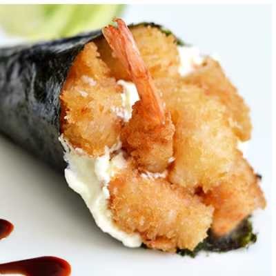 Delicioso Temaki de Camarão empanado, crocante por fora e suculento por dentro, servido com molho especial. Aproveite!