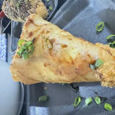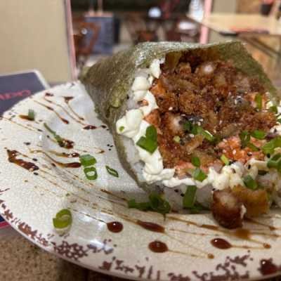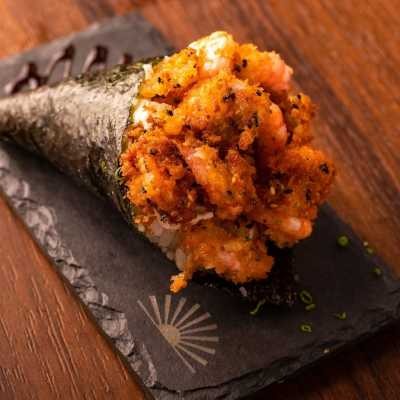 Temaki de camarão crocante na massa harumaki, recheado com ingredientes frescos e molho especial. Irresistível e saboroso!