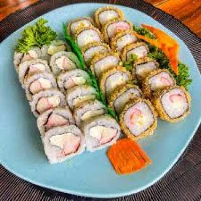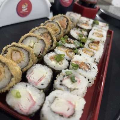 12 cariocas salmão + 12 cariocas camarão + 12 cariocas skin + 12 cariocas Kani + 10 Uramakis camarão + 10 Uramakis Kani.