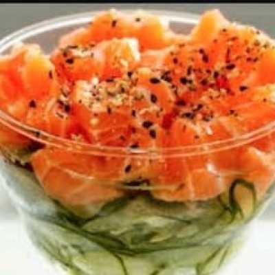 Delicioso Sunomono Misto com camarão, kani e salmão frescos, um saboroso e leve prato japonês para degustar."