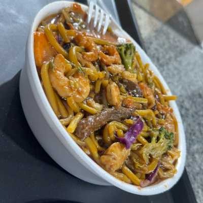 Delicioso yakissoba com camarão fresco, legumes crocantes e molho especial. Uma combinação oriental irresistível no seu prato!